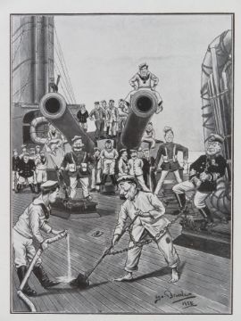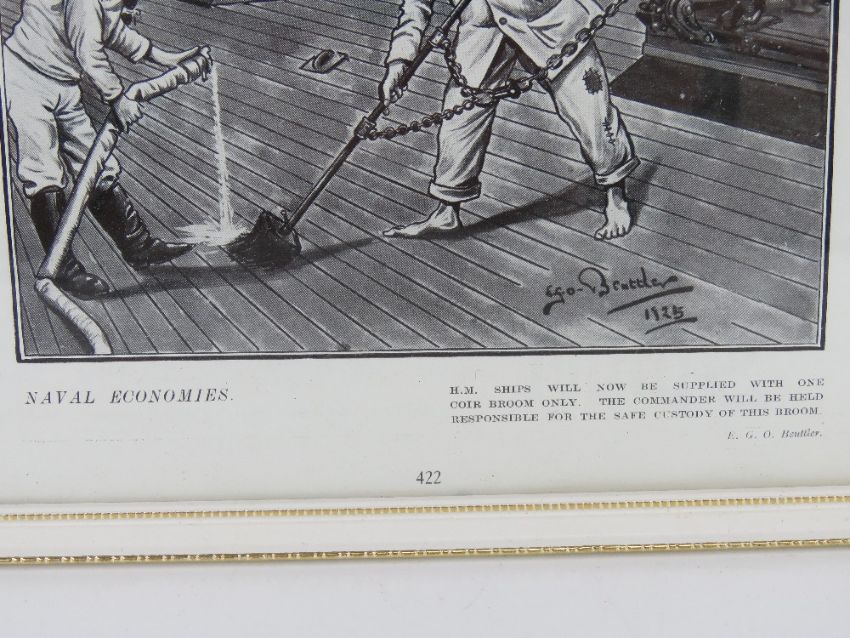 A Naval Economies comedic print 'H.M. Ships will now be supplied with one coir broom only. The Commander will be held responsible for the safe custody of this broom' by E G O Beuttler, framed, overall size 22 x 27cm.