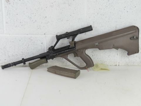 A deactivated Steyr AUG 5.56mm Assault Rifle. Latest EU Spec, with optical sight, moving trigger, safety, cocking handle. With certificate.