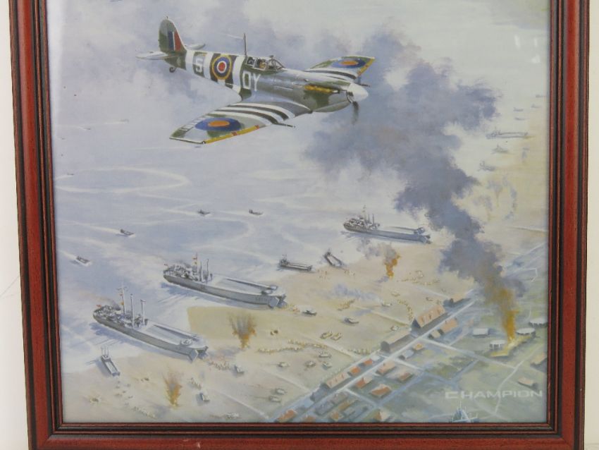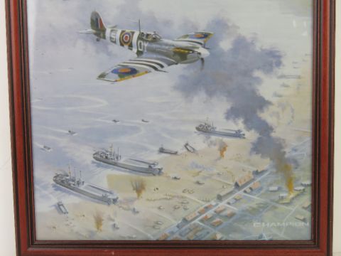 Print; Military aviation and naval theme, framed and glazed, overall size 46 x 56cm.