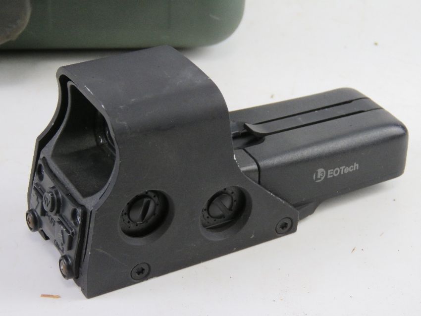 A quantity of assorted militaria inc; Day/ Night weapon sight kit type A- MK44 (M323/ GPMG) in a protective case, Eotech sights,Leica twin beam lasers, Leica twin beam filter caps, an extention rod, pro hunter kit, GPMG zeroing chart and a Minigun zeroing chart.