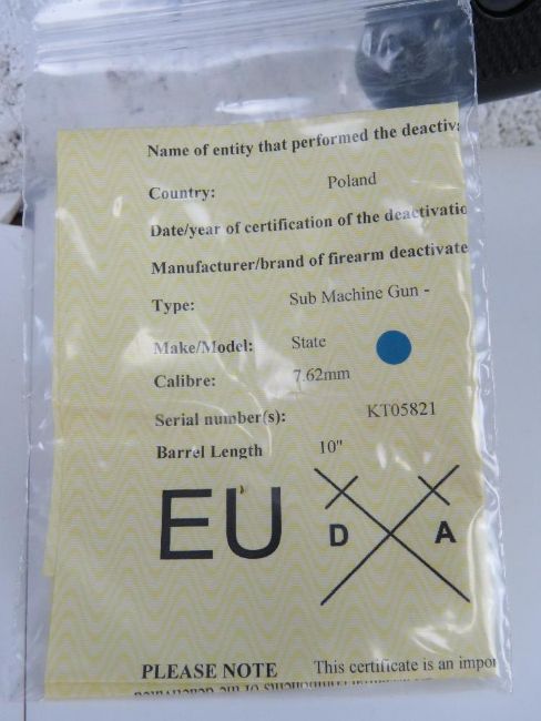 A deactivated Polish PPS-52 7.62mm Sub Machine Gun. Latest EU Spec, with moving steel dummy bolt (under spring pressure), and safety. With certificate.