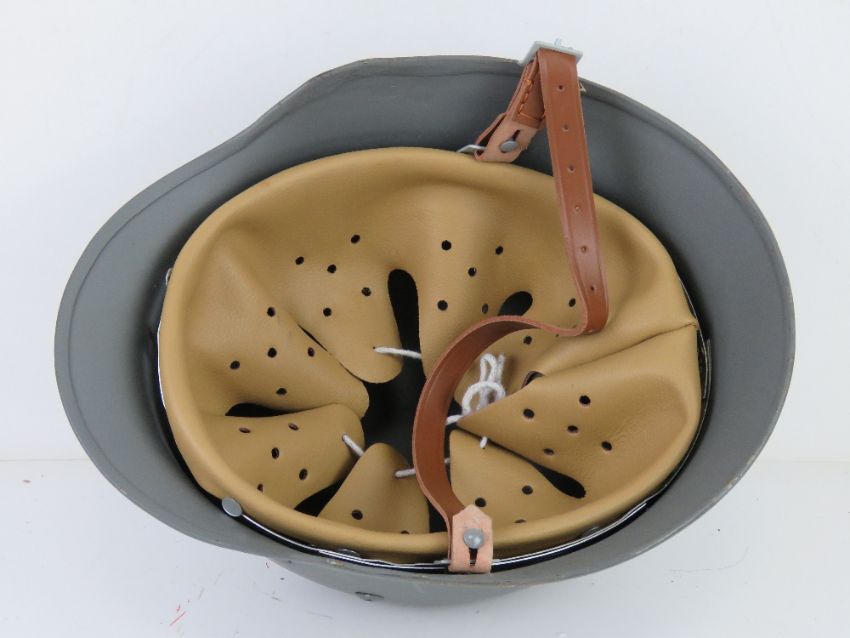A reproduction M35 helmet with repro tan water helmet cover, with liner and chin strap.