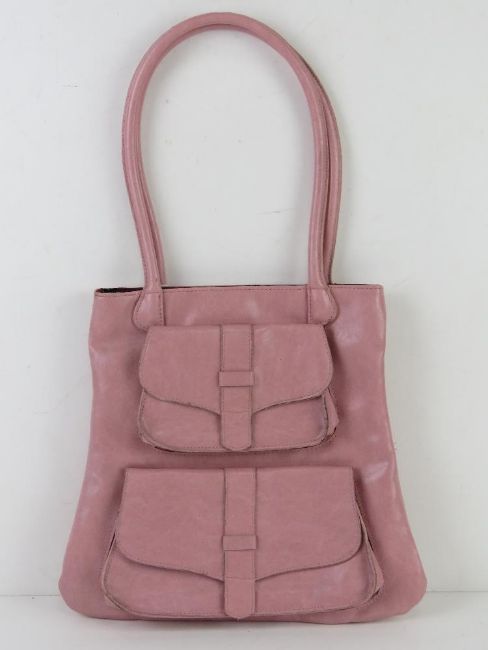 A baby pink handbag having double pocket design to front approx 31cm wide.