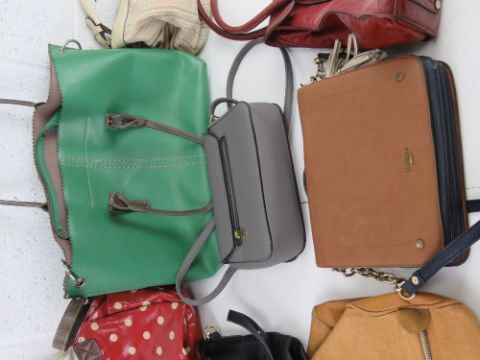 A quantity of assorted handbags inc red polka dot, green tote, vintage leather, fabric tote, grey cross-body, red handbag by Anouk, Dune cross-body, etc.
