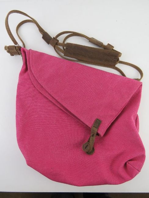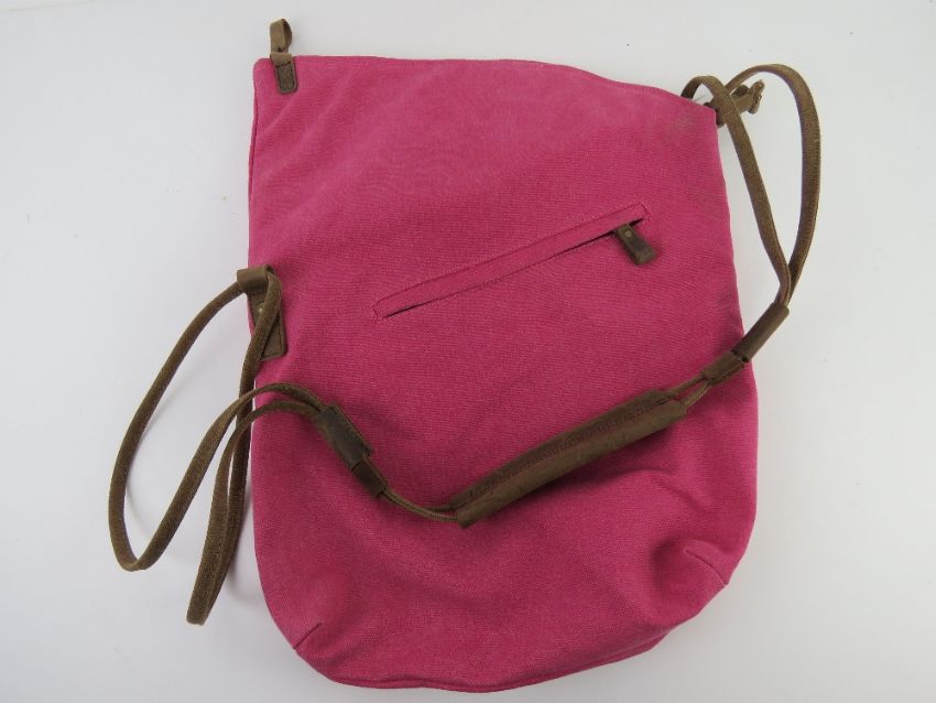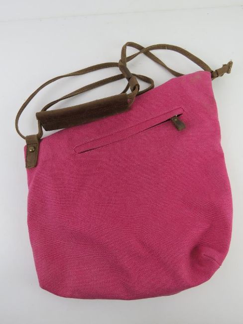 A hot pink canvas and suede cross body bag approx 34cm wide.