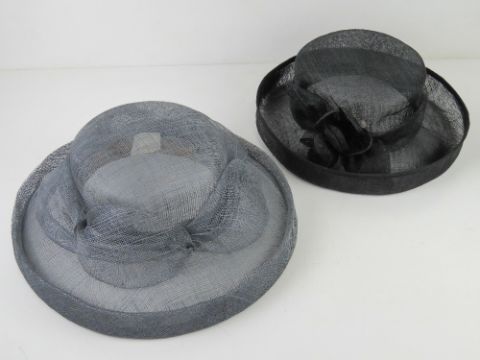 A Marks and Spencer's brown straw wedding hat together with three others similar, two black, one grey. Four items in cardboard hat box.