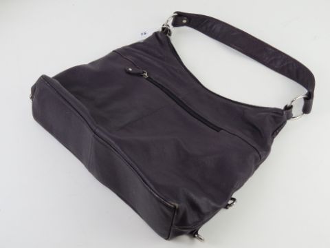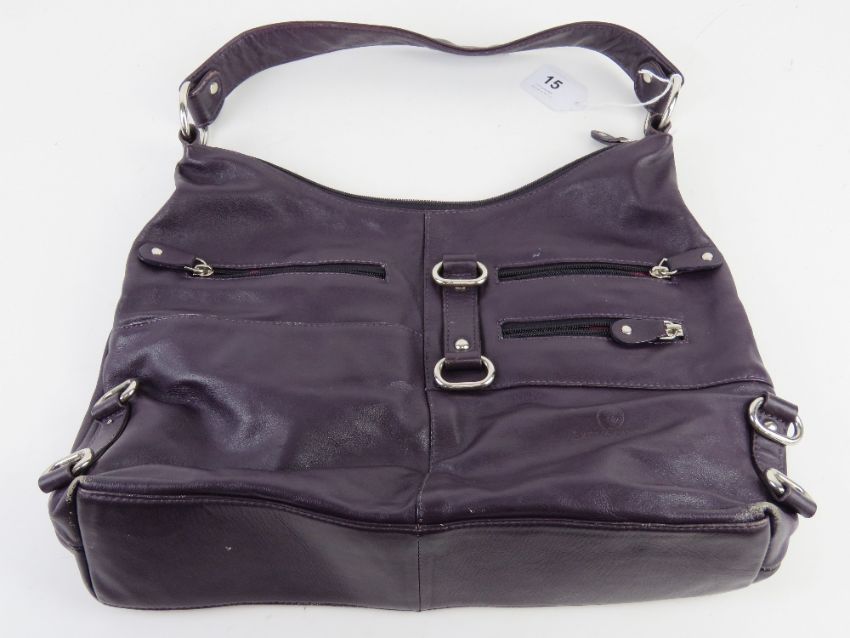 A purple leather handbag by Smith Conova, wear noted to corners, approx 37cm wide.