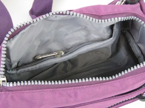 An 'as new' fabric handbag in purple measuring 21 x 15cm.