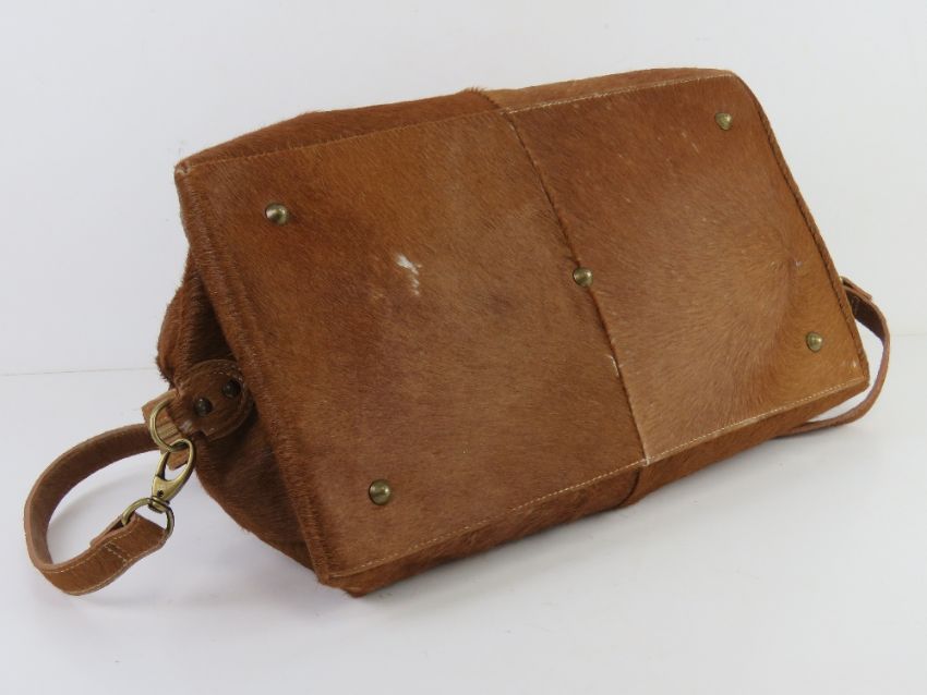 A cow hide handbag by Louise Hempleman having winged heart decoration to clasp, approx 44cm wide.