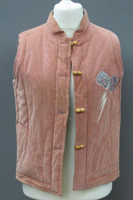 A handmade corduroy gillet by Angela Wykeham of Melton Mowbray having wooden toggle type buttons approximate measurements 40" chest, 26" length to back.