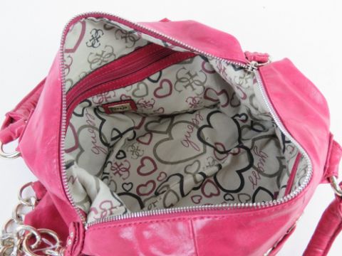 A hot pink handbag with shoulder strap by Guess, approx 30cm wide.