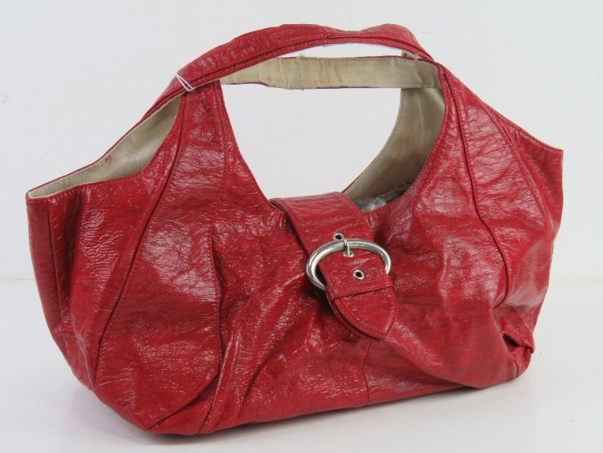 A red patent handbag by River Island approx 35cm wide.