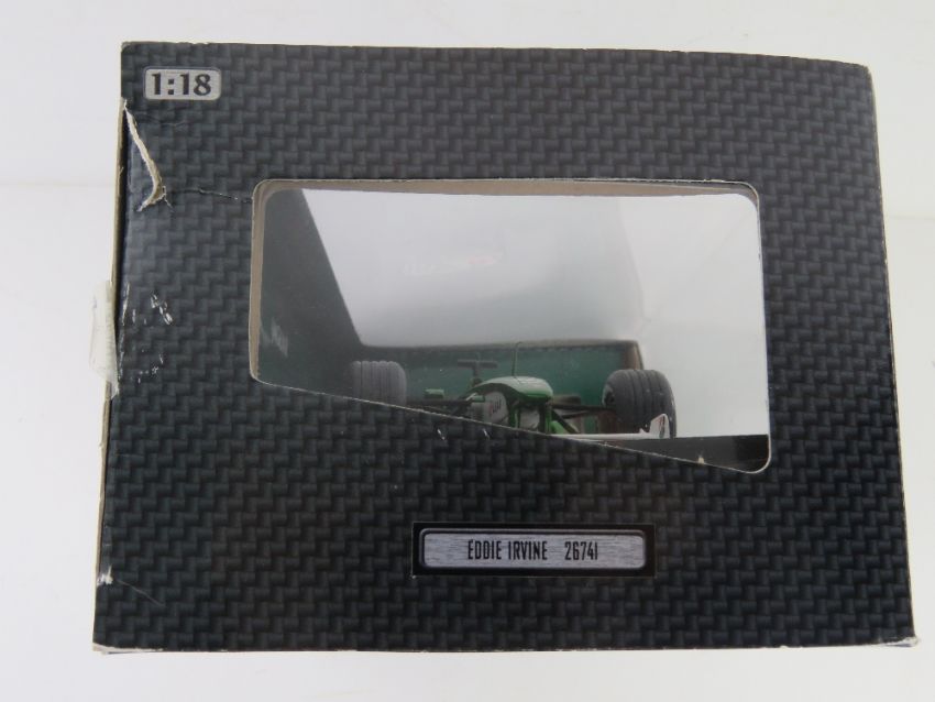 Hot Wheels 1:18 scale F1 racing car in original box; Eddie Irvine 26741.
