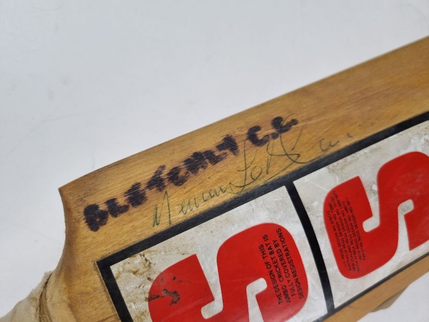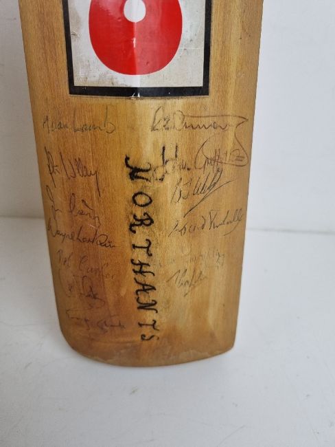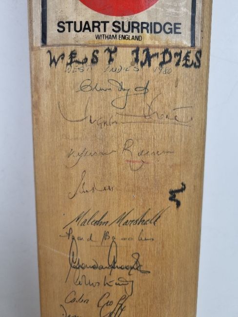 A cricket bat having West Indies 1980 team signatures upon, further signatures verso 'Northants' and 'Bletchley'.