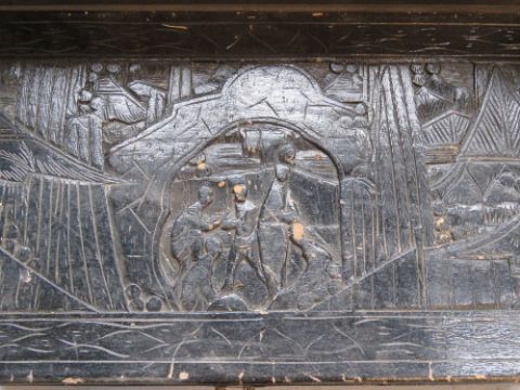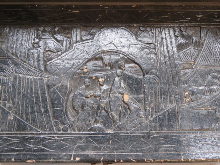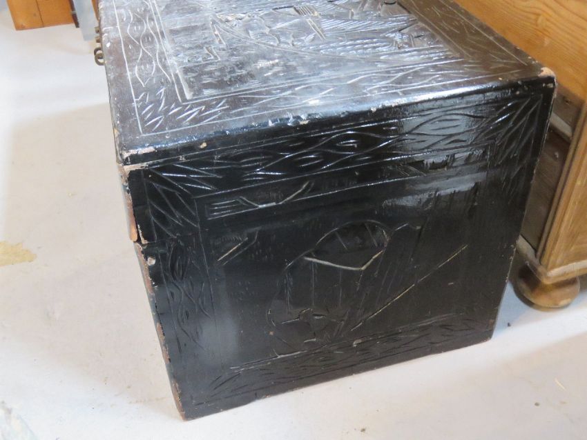 A black painted carved pine blanket box, measuring approx 101 x 50 x 47cm.