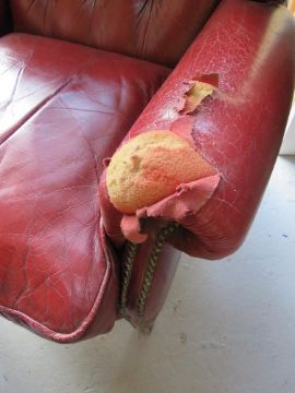 A red leather Chesterfield type wing back armchair a/f.