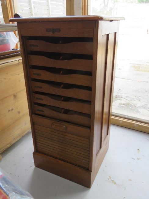 A tambour fronted music cabinet having nine drawers within, no key. Measuring approx 56 x 54 x 112cm.