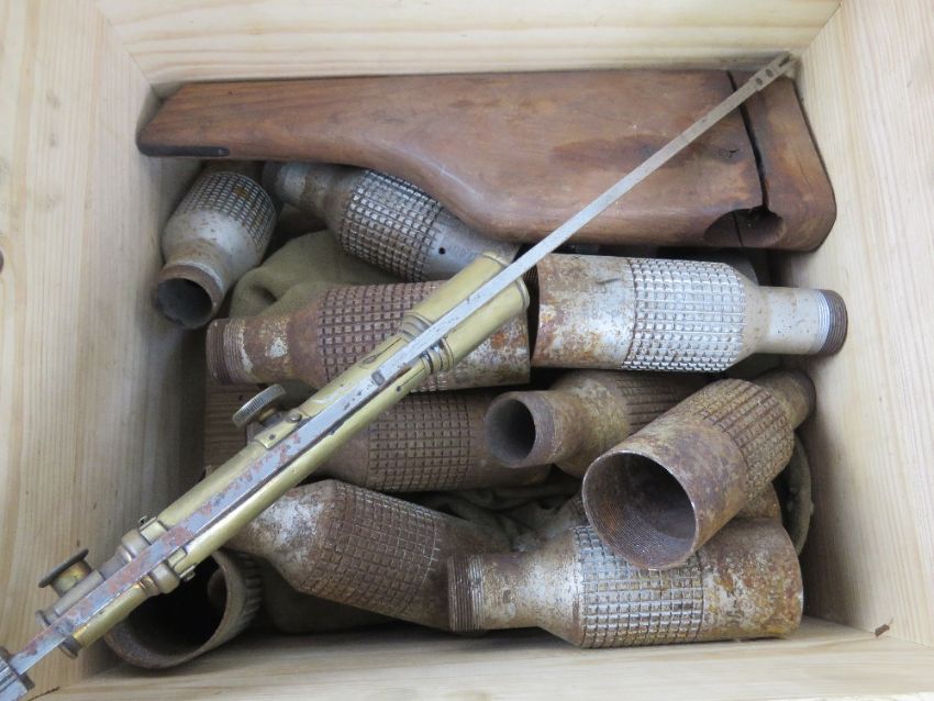 A quantity of assorted militaria inc; bren magazine pouches, M1 garand scabbard, C96 wooden stock/holster, scope and Russian PTAB cluster bomb bodies.