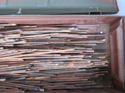 A quantity of assorted militaria inc vintage arrows and ammo box.