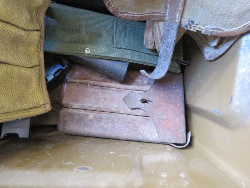 A quantity of militaria inc; .303 ammo tin with MP34 magazine pouch, a Thompson magazine pouch, two M16 stocks, a British bayonet frog, a training mine and two British tactical holders.