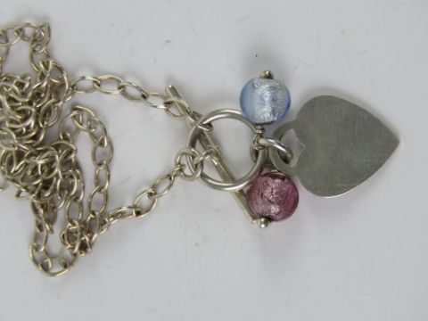 An HM silver necklace having T-bar clasp with heart shaped tag and foiled glass beads upon, hallmarked 925, chain measuring 44cm in length.