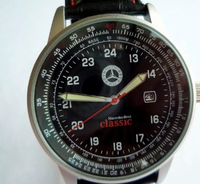 A Mercedes-Benz Classic Aviator new old stock watch C 2015. Black ground face with Arabic high-twelve numbers, luminous baton hands, red sweep seconds hands and subsiduary date aperture with Mercedes logo over.Black leather strap with red stitching and complete with original box and booklet.