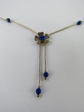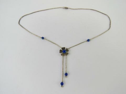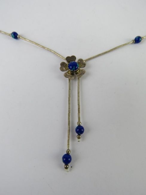 A Native American style silver beaded necklace having blue stone set floral design, marked Sterling.