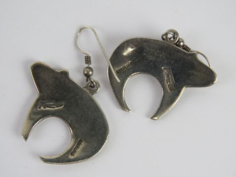 A pair of Native American silver earrings in the form of bears, each approx 3.3cm wide, stamped Sterling and having unknown maker's mark upon.