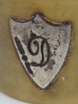 Two napkin rings; one horn napkin ring with HM silver shield shaped cabachon bearing the letter D, the other ivorex and having applied and pierced HM silver cypher upon.