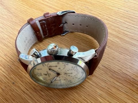 A Caribbean Joe gents wristwatch having cram face, subsidiary splits dials, baton hands and sweep seconds hand. Brown leather strap all before the Quartz battery movement.