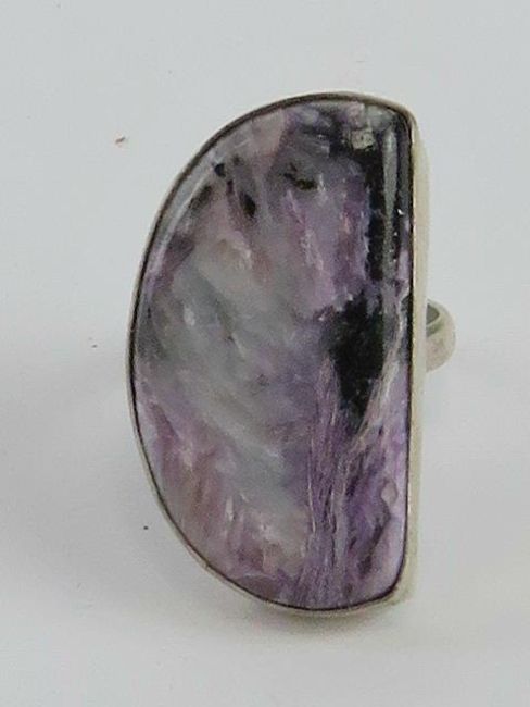 A handmade purple and black hardstone ring, the hemispherical agate approx 13 x 32mm, stamped 925, size R.