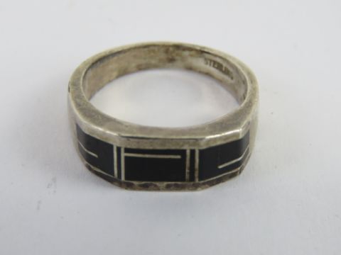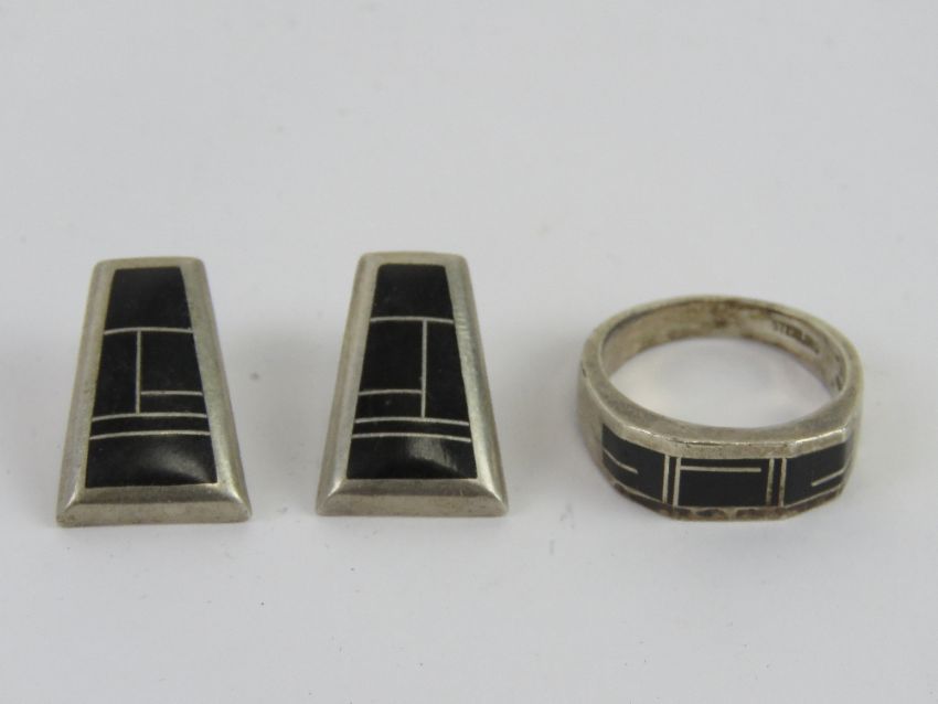 To match above lot; A set of Sterling silver and black onyx Native American jewellery comprising ring size S and earrings each marked Sterling, the earrings also marked for Teme.