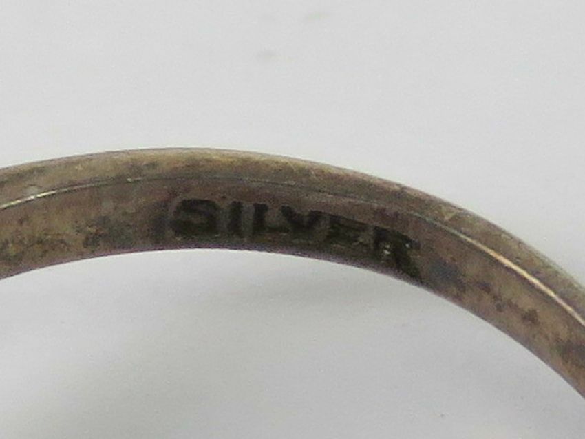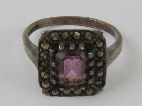 A silver marcasite and purple stone ring of Art Deco style, stamped silver, size K.