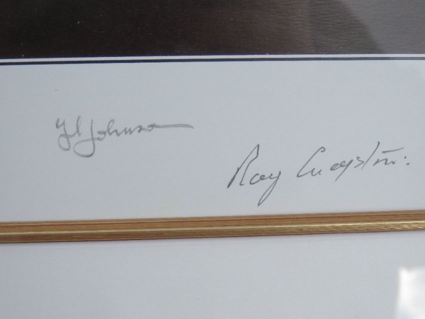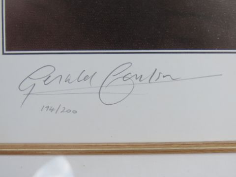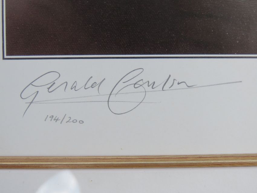 The Dambusters; 'Reaching the Mohne' by Gerald Coulson V.P.G.Av.A Lancasters of 617 Squadron score a direct hit on the Mohne Dam on the night of 16/17th May 1943. Print No 194/200 having been signed in pencil by the artist and eight of the Dambusters inc; Flight Lieutenant George Chalmers DFC DFM, Flight Lieutenant Edward Johnson DFC, Sergeant Raymond Grayston, Squadron Leader George Johnson DFM, Squadron Leader Ken Brown CGM, Flying Officer Dave Rodger DFC, Flight Lieutenant Les Munro CNZM DSO QSO DFC and Flight Sergeant Grant McDonald. Framed and mounted, sight size 68.5 x 45.5cm, overall size 96.5 x 77.5cm. With certificate from Griffon International.