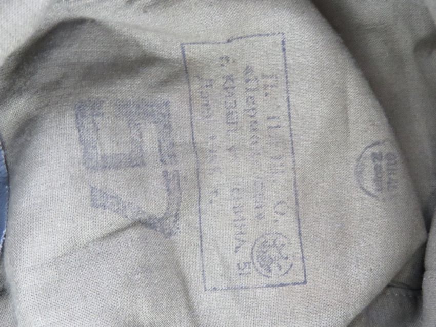 Two military ski type hats in green fabric, Russian? text and numbered 54.