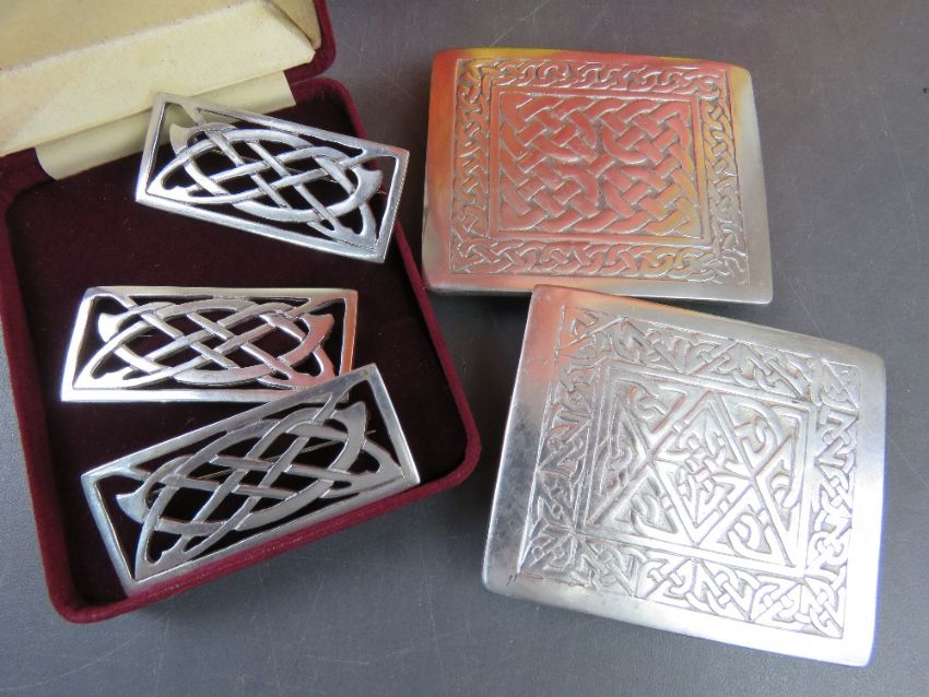 A quantity of Wilkinson sword badges and belt buckles, marked Scotland and being Celtic design, also silver polish cloths.