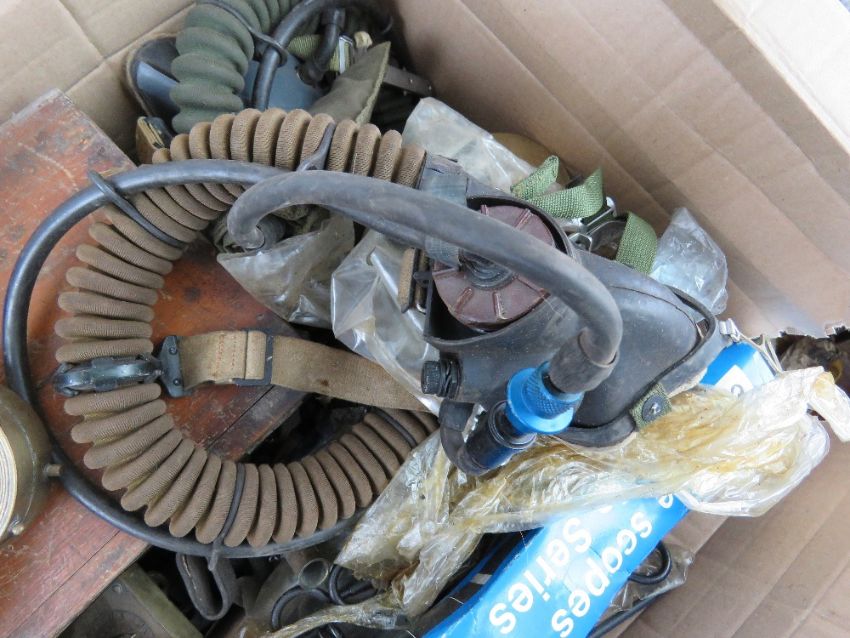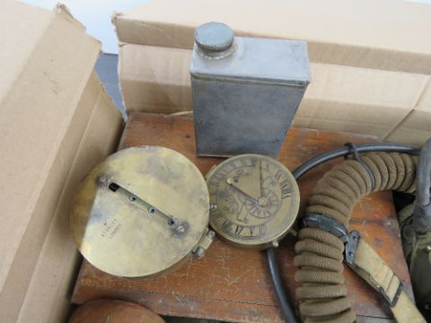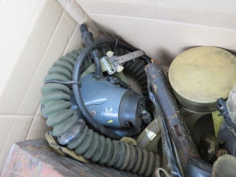 A quantity of assorted militaria inc; navy compasses, oxygen masks, Vickers training aid set, wiring diagram, rifle scope, tactical shuffle, maxim oil bottle, K98 cleaning accessories, powder flask, pistol cleaning rods, slings, etc.