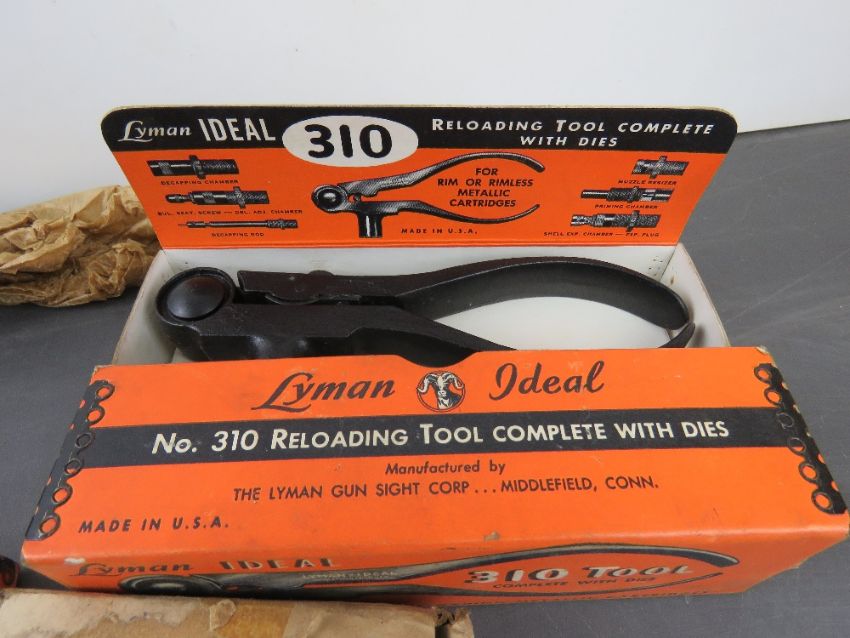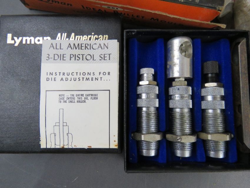 A box containing assorted militaria tools inc, dies, 1redding dies, a bullet mould, a no. 310 reloading tool with dies, bullet mould blocks, a powder flask, set of Lyman dies, etc.