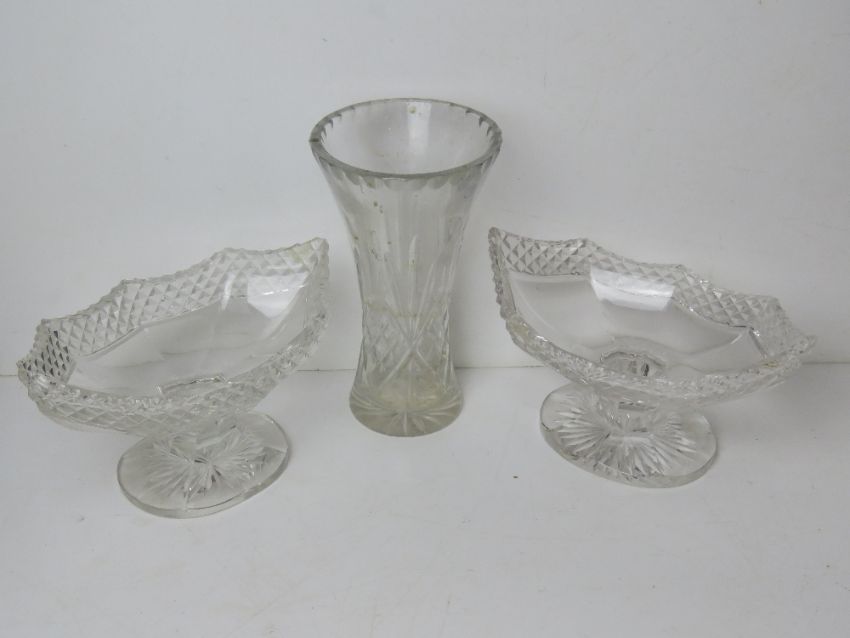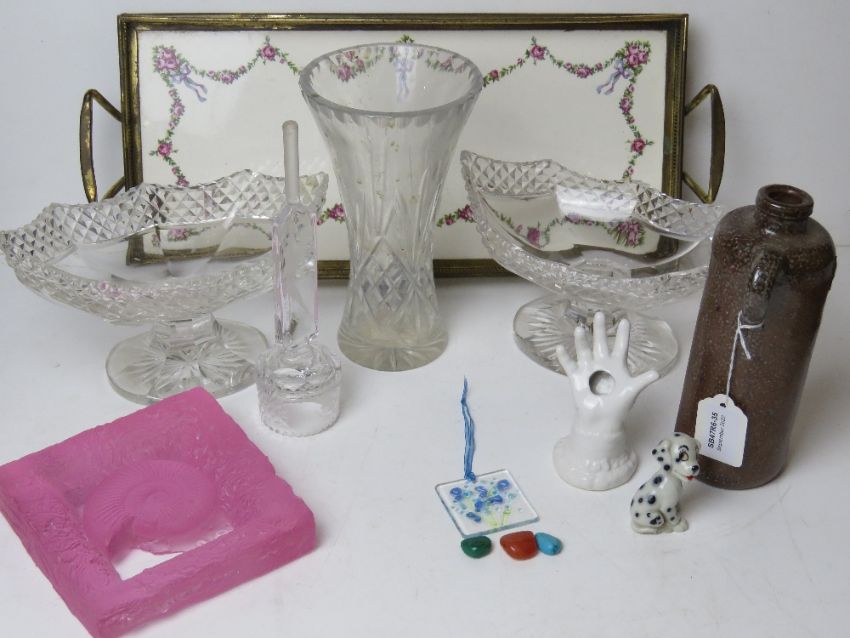 A quantity of assorted ceramics and glassware inc a pair of cut glass bon bon dishes and a Johnson glass 'ammonite' sculpture.