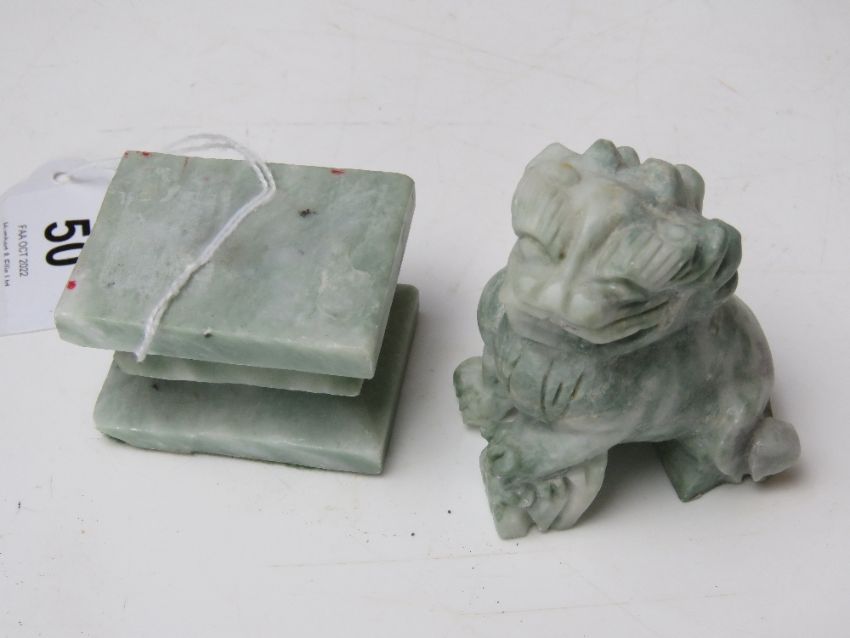Three carved stone oriental figurines being a pair of Fo dogs and horse. Together with a commemorative Great Wall of China medallion.