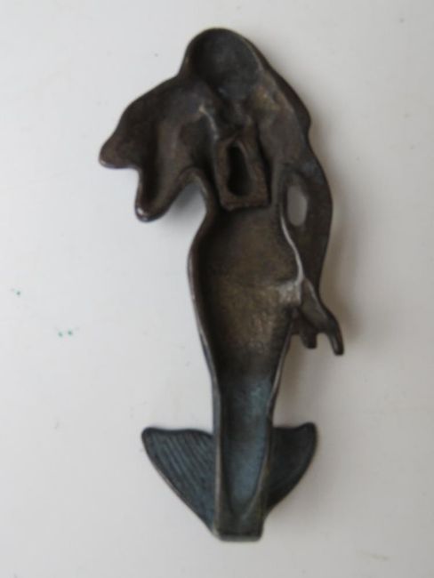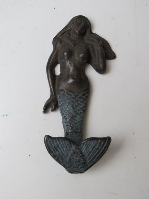 A cast metal hook in the form of a mermaid.