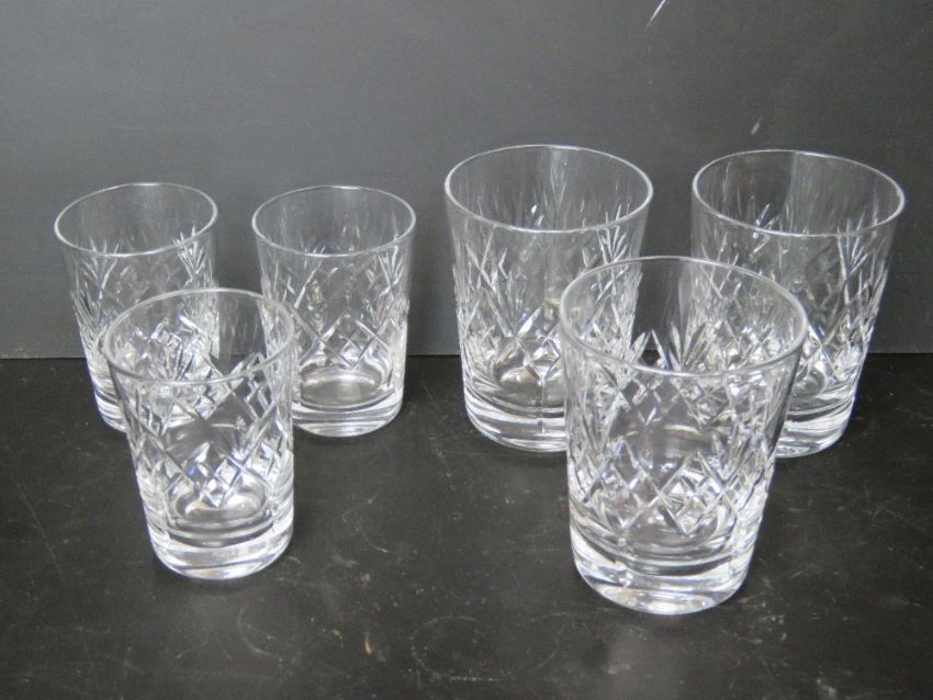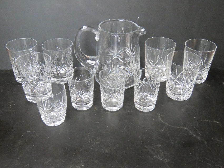 A Stuart Crystal whisky water jug together with a set of six Stuart Crystal whisky tumblers, a single Stuart small size tumbler and set of three associated tumblers.