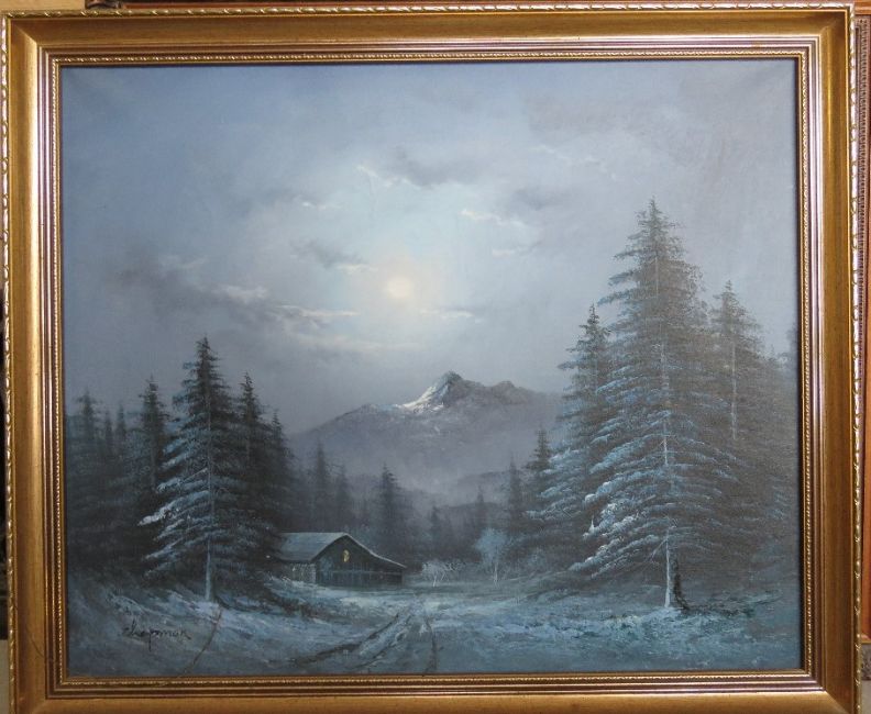 Oil on canvas; snowy evening mountainside scene, signed Chapman, 60 x 50cm, framed overall size 68 x 58cm.