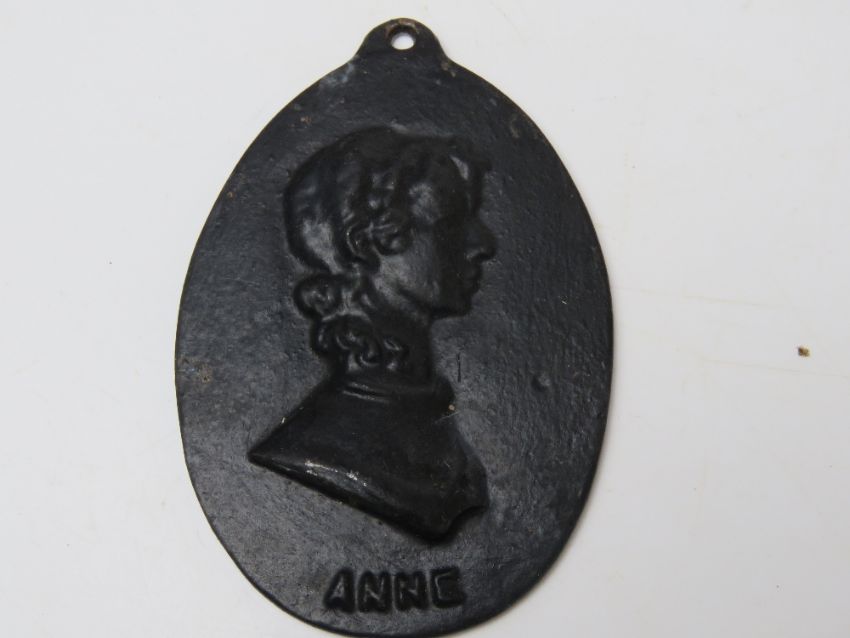 A set of three salop iron plaques being Charlotte, Emily and Anne Bronte, each 11.5cm in length.