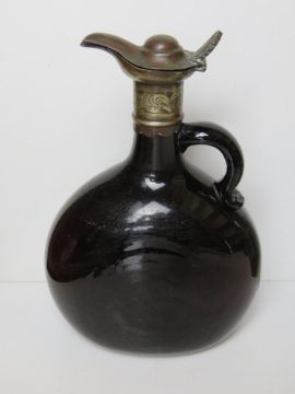 Three assorted coloured glass claret jugs, one having metal lid and cover, standing approx 10cm high.