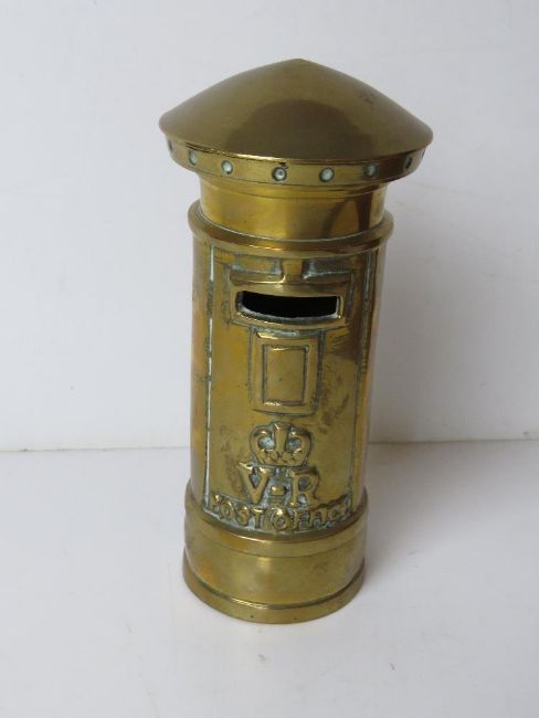 A brass money box in the form of a postbox, having VR cypher to front and standing 17cm high.