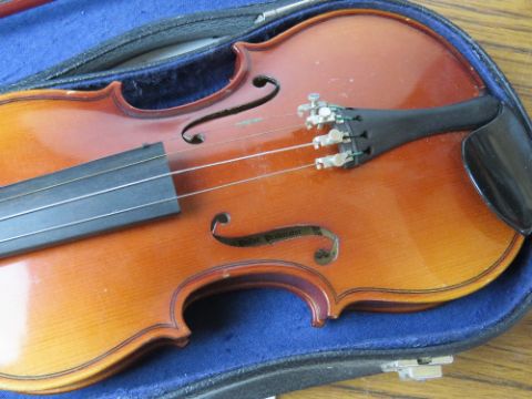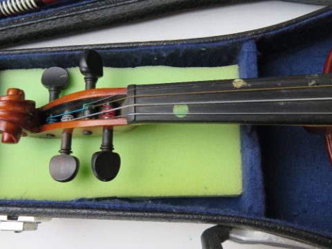 Two violins, one bearing label Michael Poller and having P&H London bow, in case, the other bearing label for Rosetti, a/f, with bow, in case.