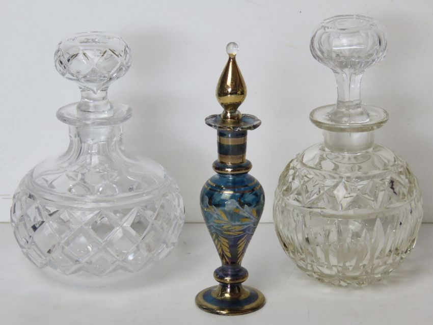 Two cut glass perfume bottles, each with stopper, together with Venetian style glass perfume bottle. Three items, tallest approx 16cm high.