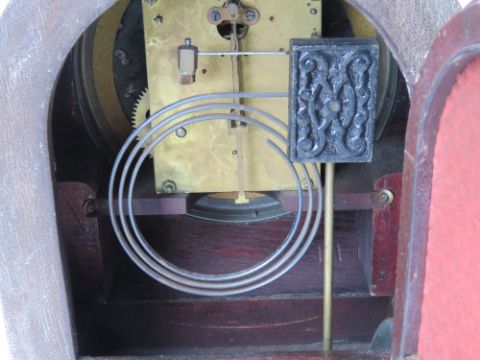 A vintage mantle clock having silvered dial with black painted Arabic numerals upon, with pendulum, standing approx 31cm high.