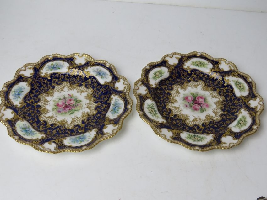 A pair of Royal Worcester cabinet plates of floral pattern upon white and cobalt blue ground with profuse gilded decoration throughout. Rd No 312289, having puce backstamp 51. Each approx 22cm dia.